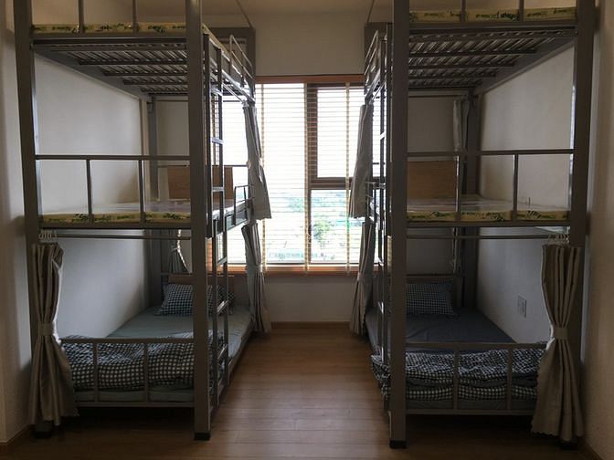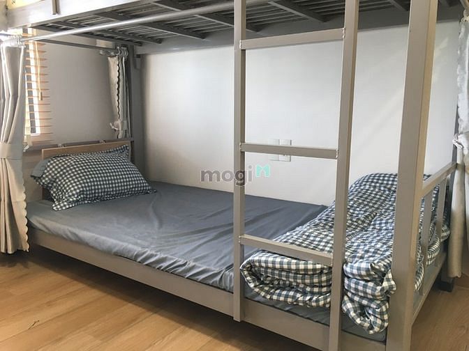 - Bố trí: Phòng thiết kế hiện đại, có cửa sổ kính rộng, đầy đủ nội thất với giường tầng cao cấp, bàn học và rèm tạo sự riêng tư.